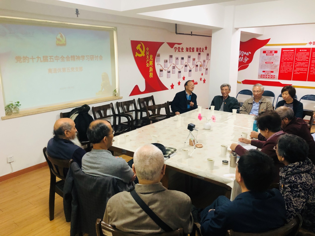 根据离退休党总支工作部署,结合校党委组织部十一月主题教育学习要求,退休五支部在11月18日组织了由部分教授和全体支委参加的“学习和交流十九届五中全会精神”为主题的组织生活会。