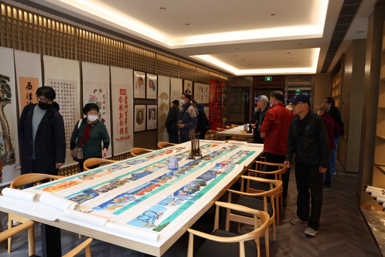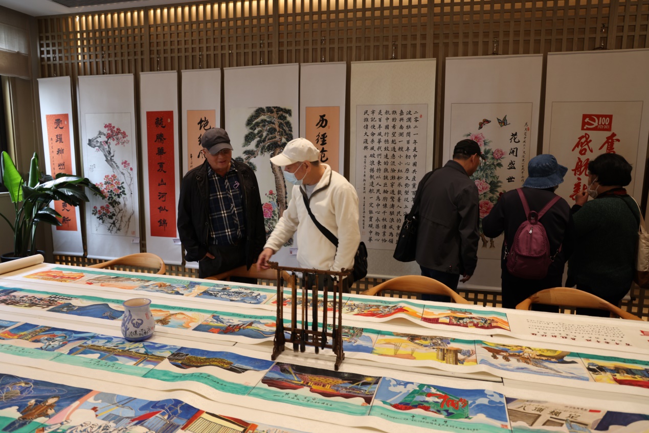 步入一个个活动室,老师们欣赏着正在举办的庆祝建党百年书画展和小幅油画、布艺作品、贝雕等长者们亲手制作的精美佳作,纷纷为长者们爱党爱国爱生活的情怀和展现出的多样才华而啧啧称赞。
