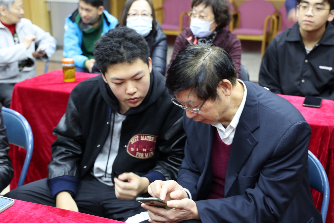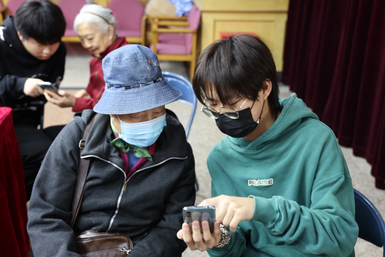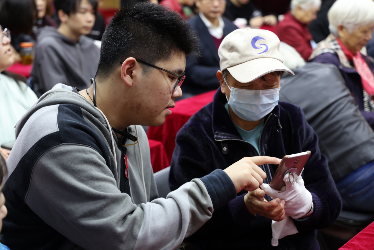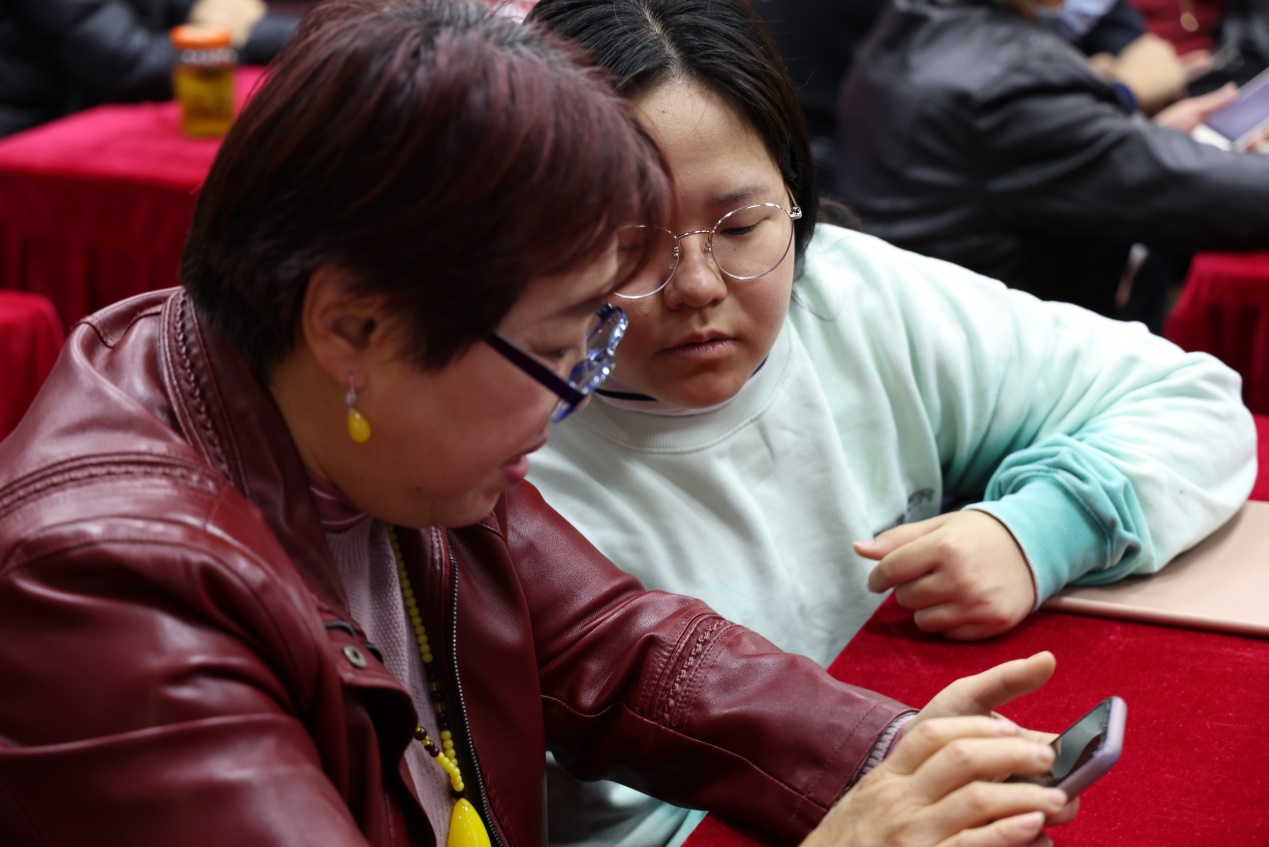 台上老师进行现场讲解,台下的学生志愿者坐在老同志身边进行指导。