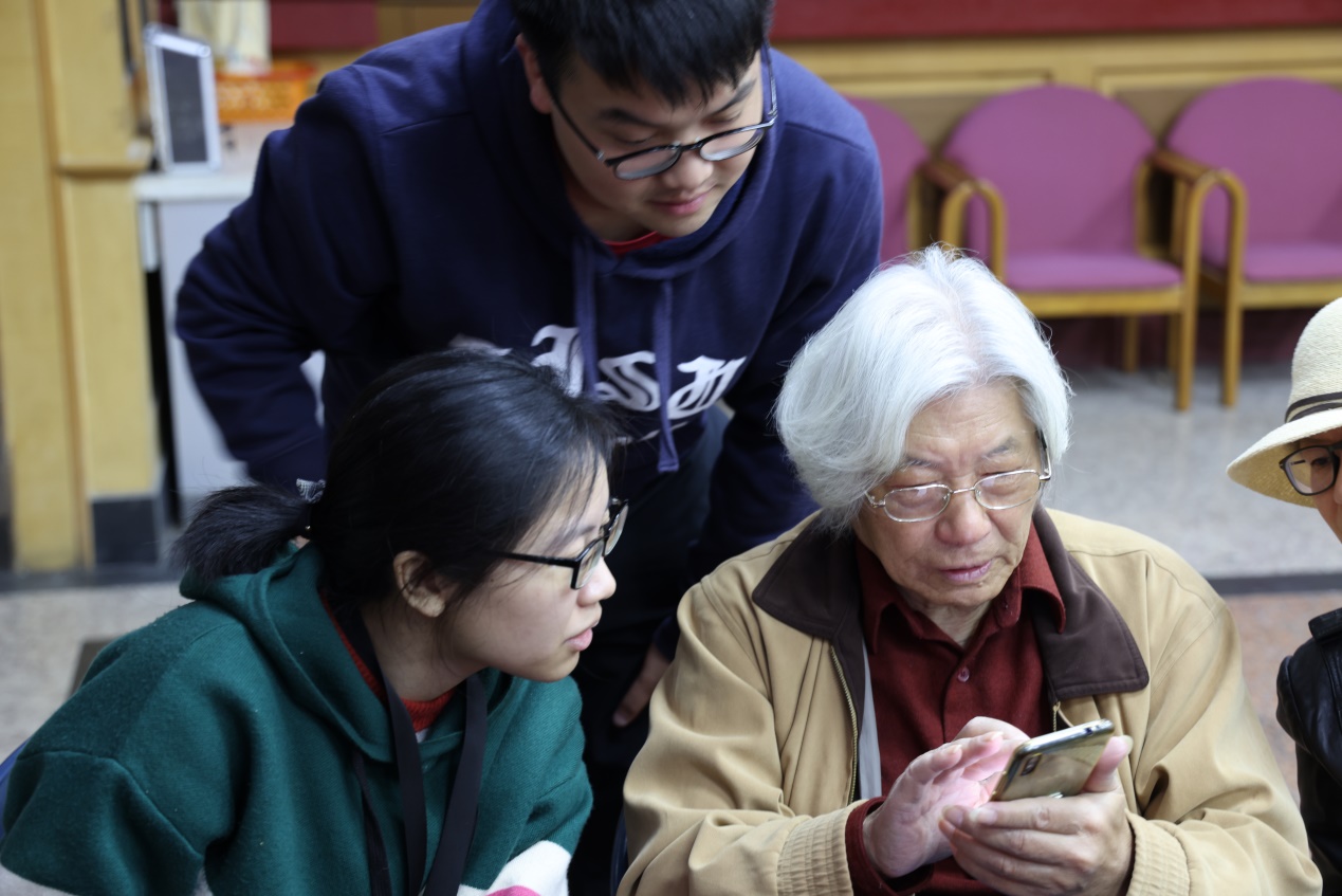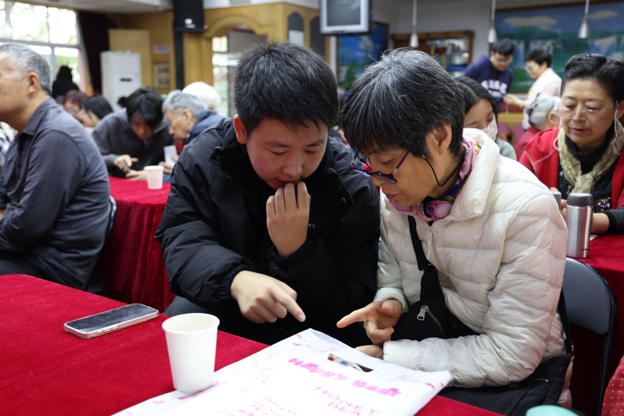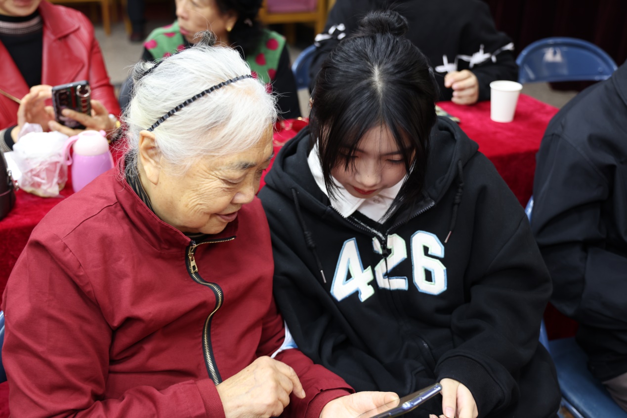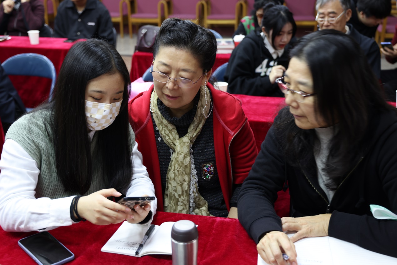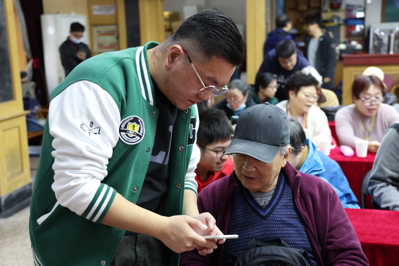 台上老师进行现场讲解,台下的学生志愿者坐在老同志身边进行指导。