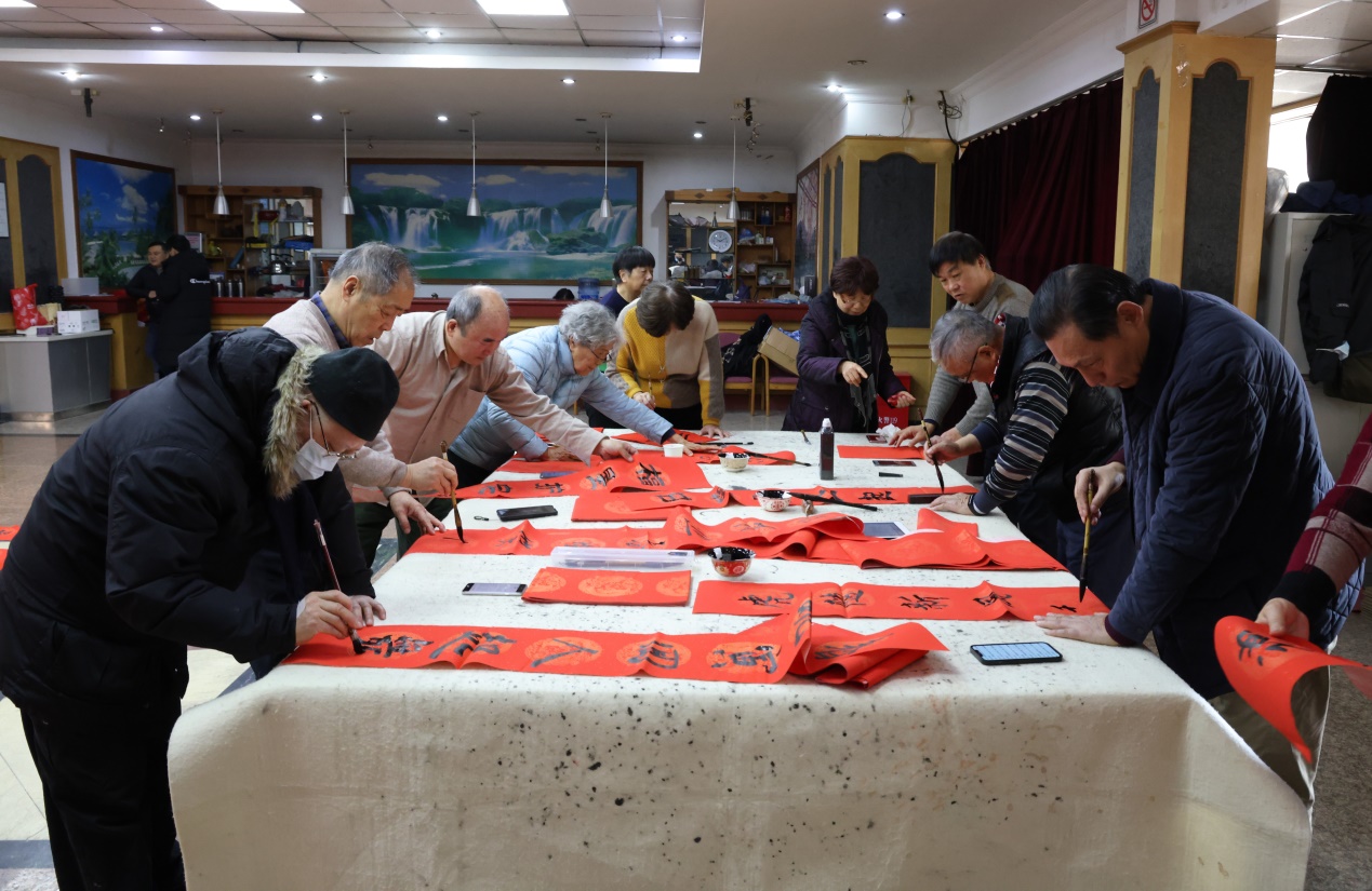 虎年纳新福,春联写吉祥。随着2022年虎年新春的脚步越来越近,为营造喜庆祥和的节日氛围,弘扬传统文化艺术,1月7日离退休工作处在虹口校区立泰苑多功能厅举办了“写春联、送祝福”活动,立泰书画社的十余位老同志参加。