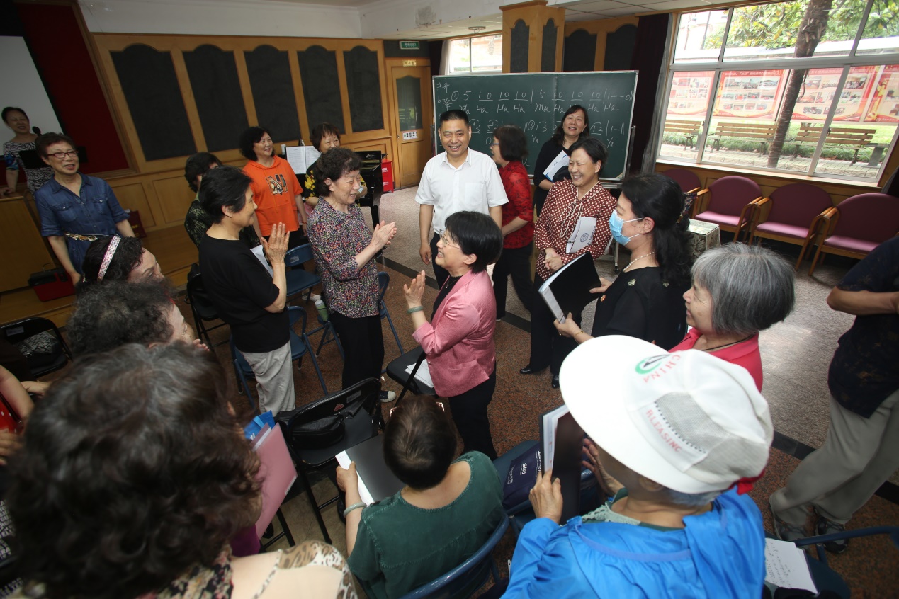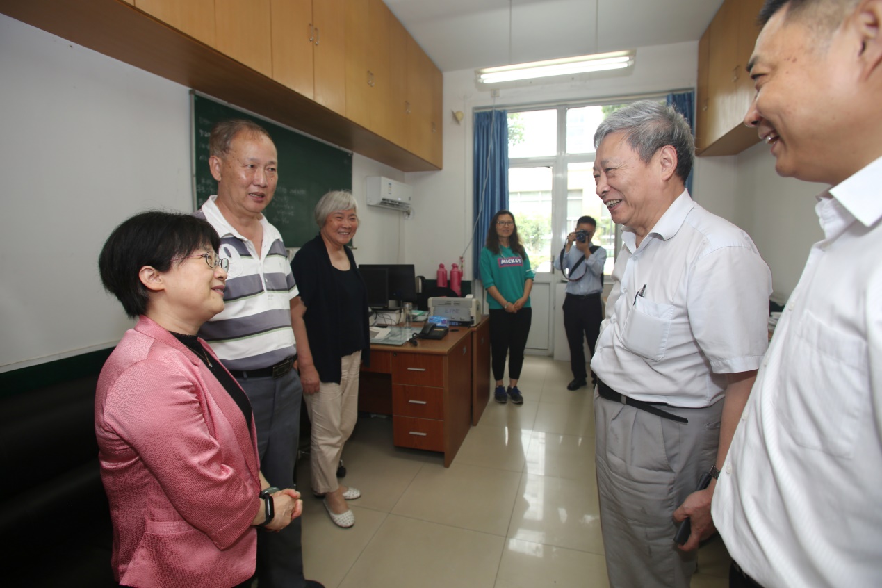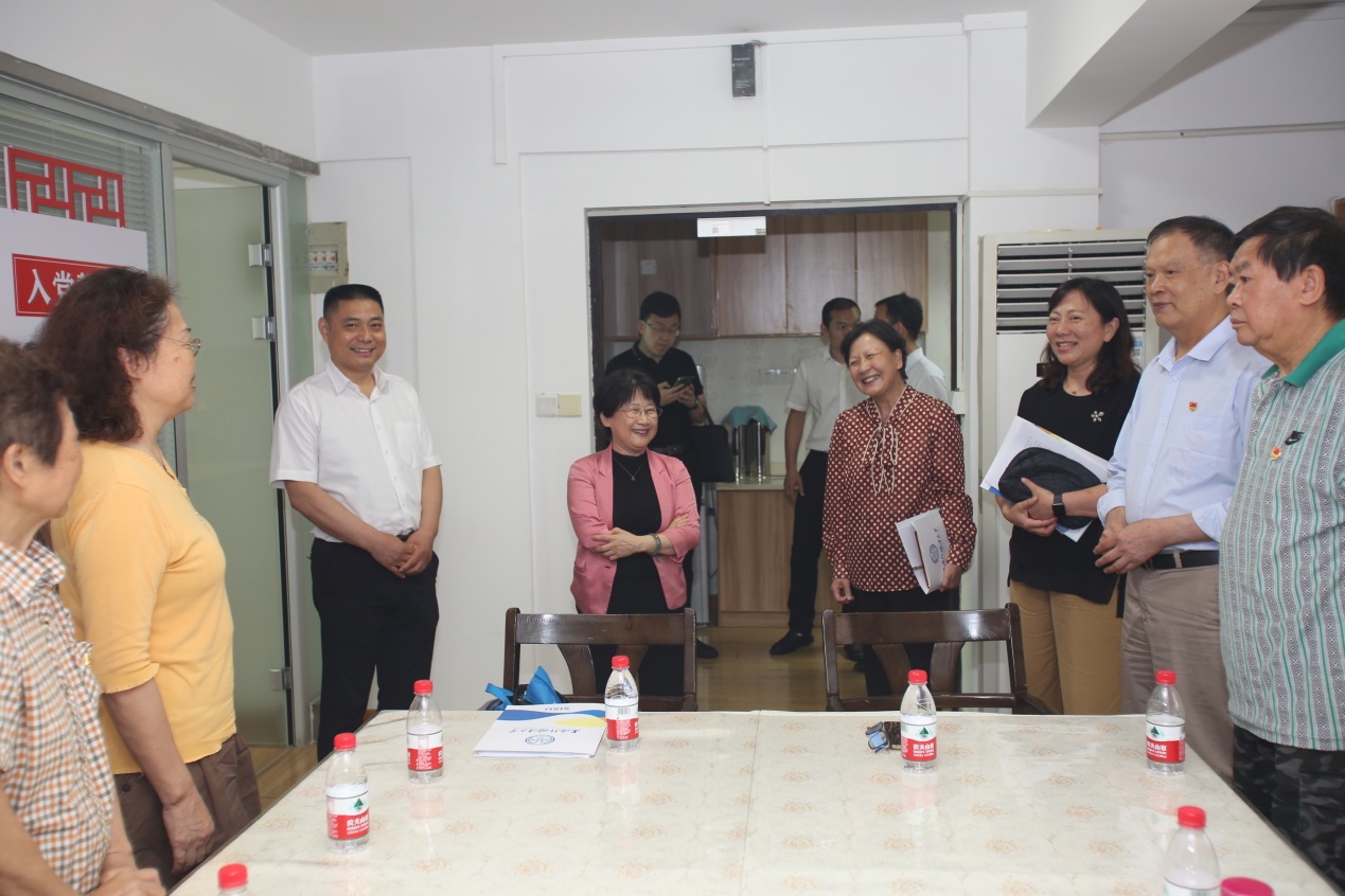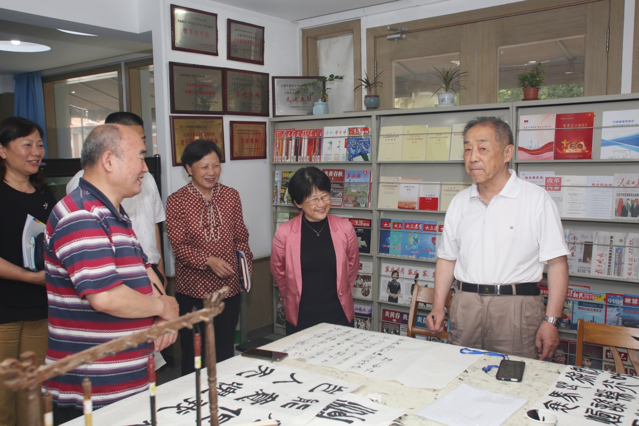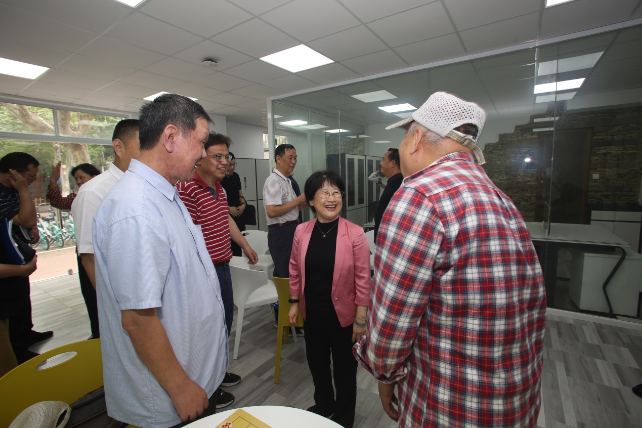 于虹局长一行还参观了我校老干部社团活动场地、离退休工作处办公场地和立泰语言文化学院。在参观过程中,于虹局长与正在参加支部书记例会、兴趣社团活动的离退休老党员、老同志进行了深入互动交流,了解他们的身体健康及活动情况,鼓励他们继续为教育事业发挥余热,增添正能量。