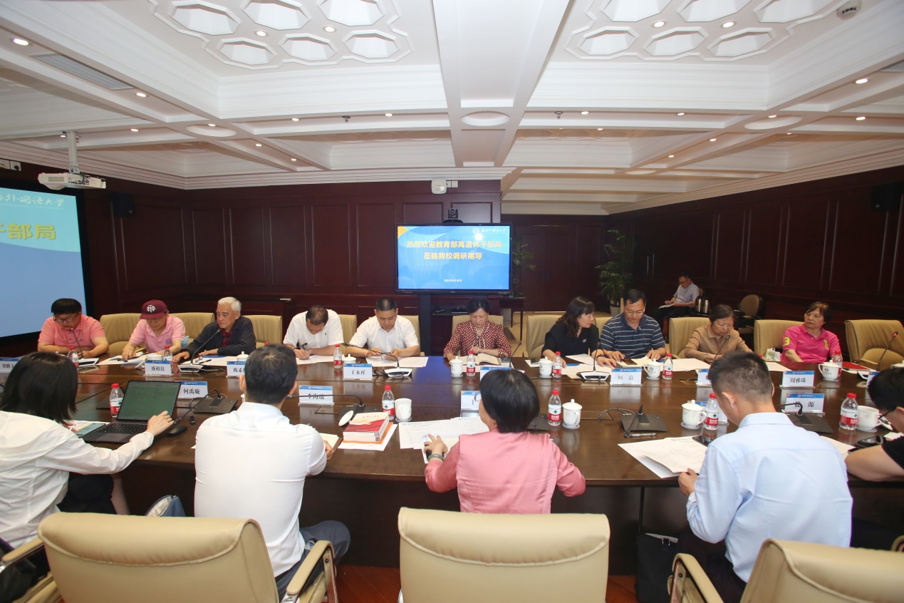 6月20日上午,教育部离退休干部局党委书记、局长于虹,组织人事处处长李海瑞、老部长秘书室主任夏晖等一行五人来到上海外国语大学调研指导离退休工作。校党委副书记王静及离退休工作处负责同志陪同调研并参加座谈会。会后,校党委书记姜锋、校长李岩松与于虹局长一行进行了短暂的会晤。