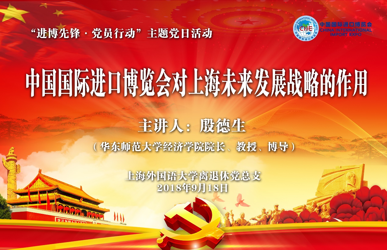 今年的115日至10日,首届中国进口国际博览会(简称“进博会”、CIIE)将在上海国家会展中心举行。为了迎接进博会的召开,918日上午930分,上外离退休党总支在虹口校区会议中心第二报告厅举办了“进博先锋党员行动”主题党日活动。此次活动特邀华东师范大学经济学院院长、博士生导师殷德生教授做专题为《中国国际进口博览会对上海未来发展战略的作用》的讲座。上海外国语大学离退休工作处处长丁永祥、资产经营管理公司党总支书记石彤喆、后勤工作管理处党总支书记张明出席。 三个部门的全体在职党员和各离退休支部的书记、委员共80多人出席此次活动。本次主题党日活动是根据市委和校党委组织部倡议,离退休党总支积极行动,与资产经营管理公司、后勤工作管理处共同落实,将做进博先锋党员行动作为党组织之间的很好的一次学习、交流活动。