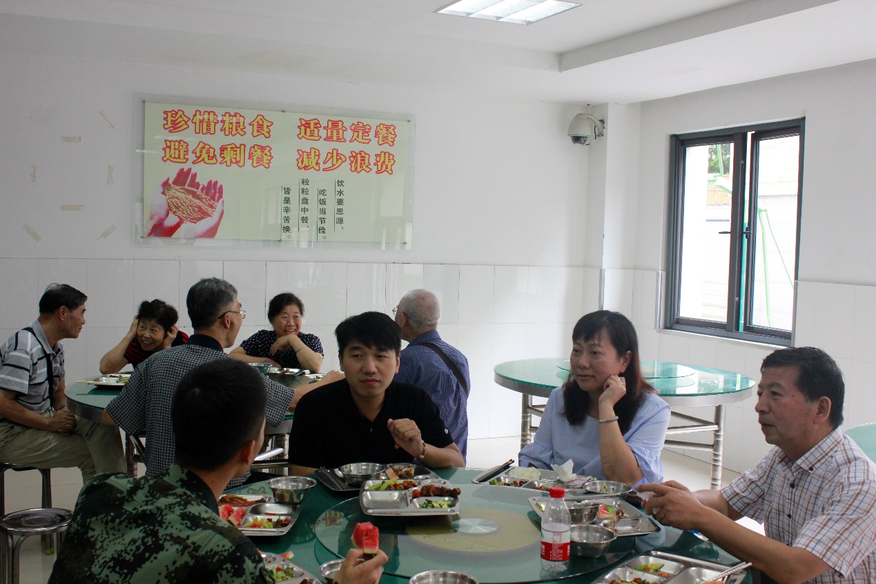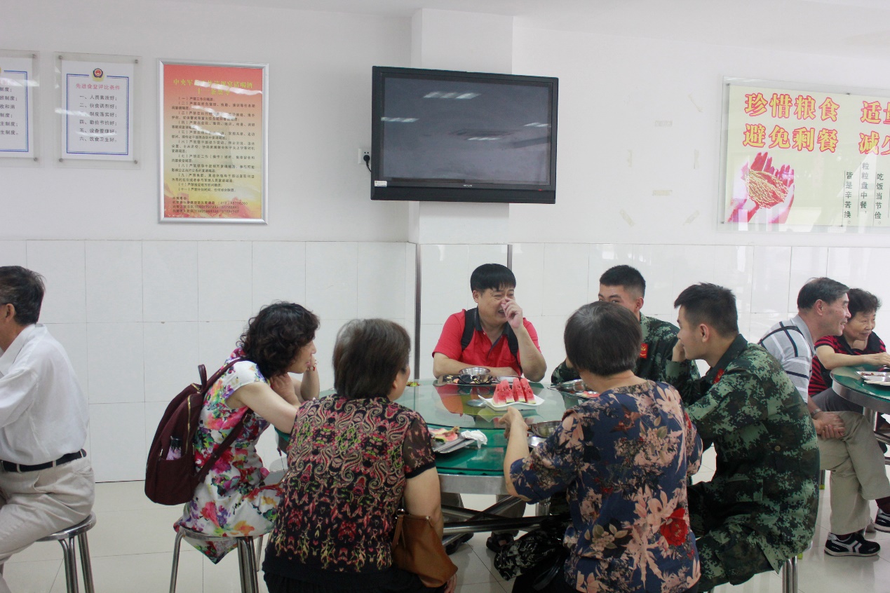 中午老兵们来到中队食堂和官兵们共进午餐。在交流中老同志还向战士讲起他们那个年代当兵的艰苦奋斗的经历,军营中一些感人的事迹和有趣的故事。战士们也向老兵们介绍了现在部队的情况和他们在应对各种突发事件时的经历。