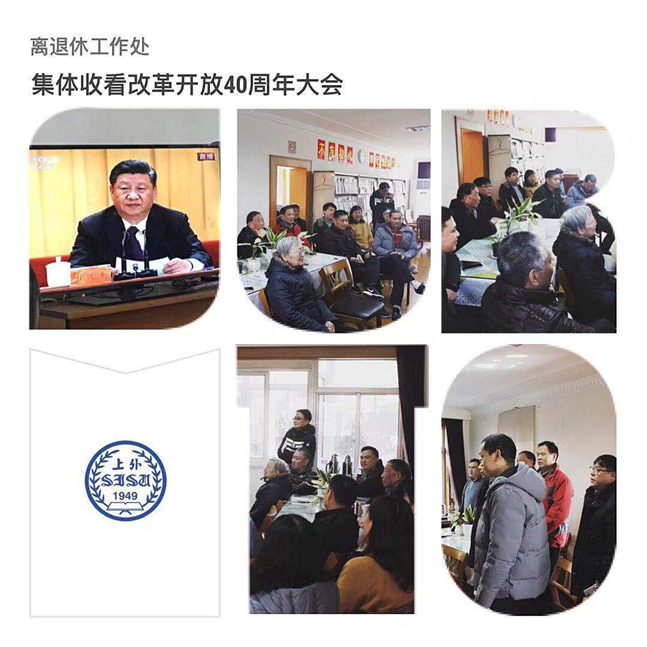 2018年12月18日上午10点,庆祝改革开放40周年大会在人民大会堂隆重举行。中共中央、国务院对改革开放40年来做出杰出贡献的100名“改革先锋”称号获得者和10名“中国改革友谊奖章”获得者进行了表彰。中共中央总书记、国家主席、中央军委主席习近平发表重要讲话。上外离退休党总支组织在职支部党员和部分离退休老党员一起观看了大会直播盛况,认真聆听习近平同志的重要讲话。上外各离退休支部老同志也通过各种方式收听收看大会直播,党总支通过各支部以座谈、微信群交流等多种方式,热议改革开放以来所取得的巨大成就。