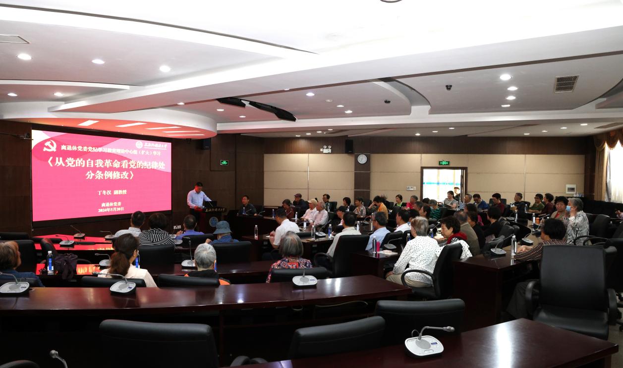 离退休党委于5月20日举行党纪学习教育理论中心组(扩大)学习,邀请马克思主义学院党纪学习教育宣讲团丁冬汉副教授做《从党的自我革命看党的纪律处分条例修改》专题辅导报告。离退休党委委员、离退休工作处领导班子成员、支部书记、支委、在职支部党员、部分离退休党员近60人参加学习。报告会由离退休党委书记、离退休工作处处长丁永祥主持。