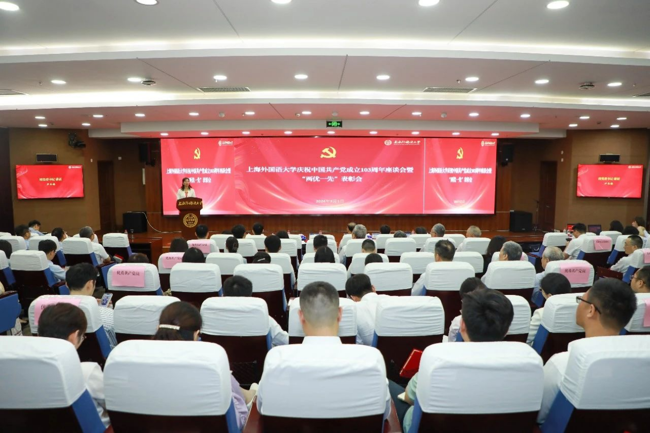 在中国共产党成立103周年、全党上下深入推进党纪学习教育之际,7月1日上午,上海外国语大学在松江校区召开庆祝中国共产党成立103周年座谈会暨“两优一先”表彰会,表彰学校先进基层党组织、优秀共产党员和优秀党务工作者,并为“光荣在党50年”老党员代表颁发纪念章。教育部党建工作联络员江波出席会议,校党委书记尹冬梅参加会议并讲话,校党委副书记、校长李岩松宣布学校“两优一先”名单,校党委副书记王静宣读“光荣在党50年”老党员名单。