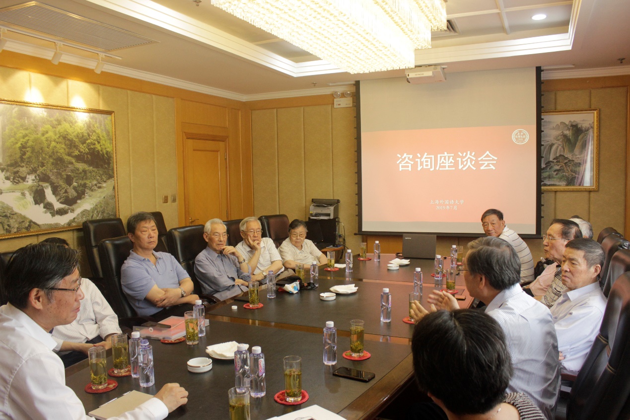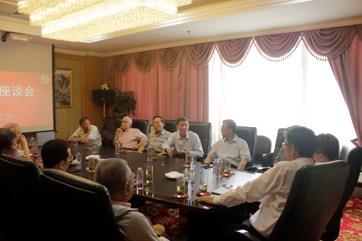 7月4日上午,在上外迎宾馆二楼会议室,上外校党委书记姜锋、校长李岩松与学校退休老领导齐聚一堂,以聚焦学校的“双一流”建设、迎接70年校庆为主题,进行座谈交流,畅谈学校发展前景,共绘上外发展宏图。校党委副书记王静主持座谈会。十多位退休局级老领导以及校党委办公室主任李仁东和离退休工作处部门负责人参加了座谈会。