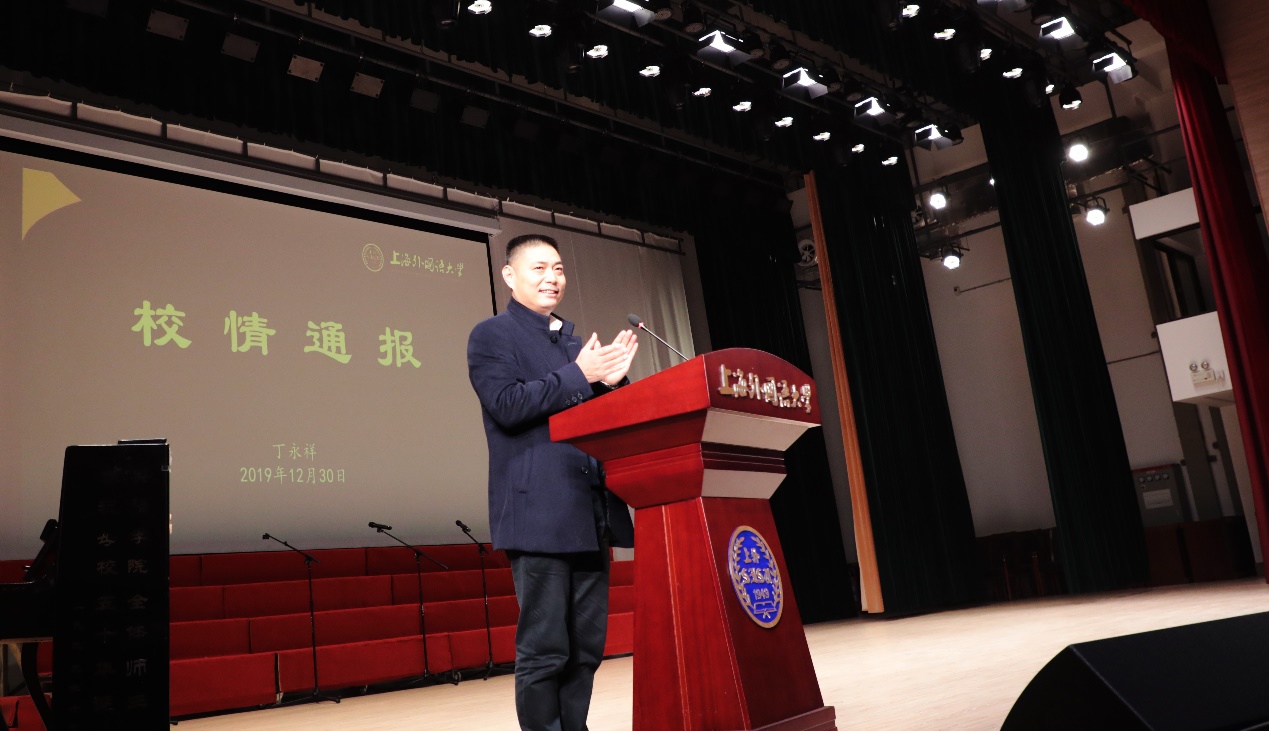 丁永祥向老同志们作校情通报。他首先向参加联欢会的老领导、老同志致以节日的问候,向全校离退休教职工致以美好的祝愿,衷心地祝大家新年快乐、身体健康、阖家幸福、万事如意。他表示,即将过去的2019年是极不平凡的一年,有很多值得纪念的时刻。全校离退休老同志和师生们一起欢庆中华人民共和国成立70周年和上外建校70周年。 70年来,我校老同志们亲历和见证了新中国从站起来、富起来到强起来伟大的飞跃,亲历和见证了上外一个又一个历史性的突破与跨越,这其中离不开老同志们数十年如一日把青春挥洒在上外、把事业倾心在上外,用无私奉献铸就上外今日的辉煌。2019年学校各项成绩的取得,是全体广大师生员工共同努力的结果,同样也凝聚了各位老领导、老同志们的心血。