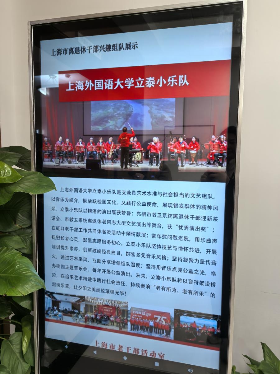 近年来,上海外国语大学立泰小乐队多次亮相市教卫系统离退休干部迎新茶话会、市教卫系统离退休老同志大型文艺演出等舞台,用经典旋律讴歌时代精神,传递老同志的正能量;同时,他们也不忘回馈社会,多次走访敬老院进行公益慰问演出,用悠扬的乐曲声抚慰长者心灵,展现了志愿服务社会的崇高情怀和初心。
